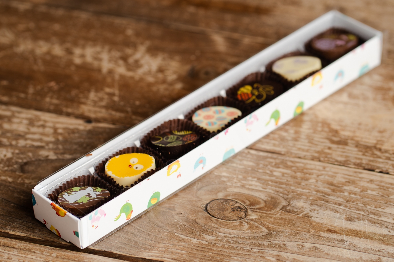 Coffret de 7 chocolats fins aux couleurs et saveurs printaniére. Parfait pour cadeaux d'hotesses, employés ou pour s'offrir à soi-même.
